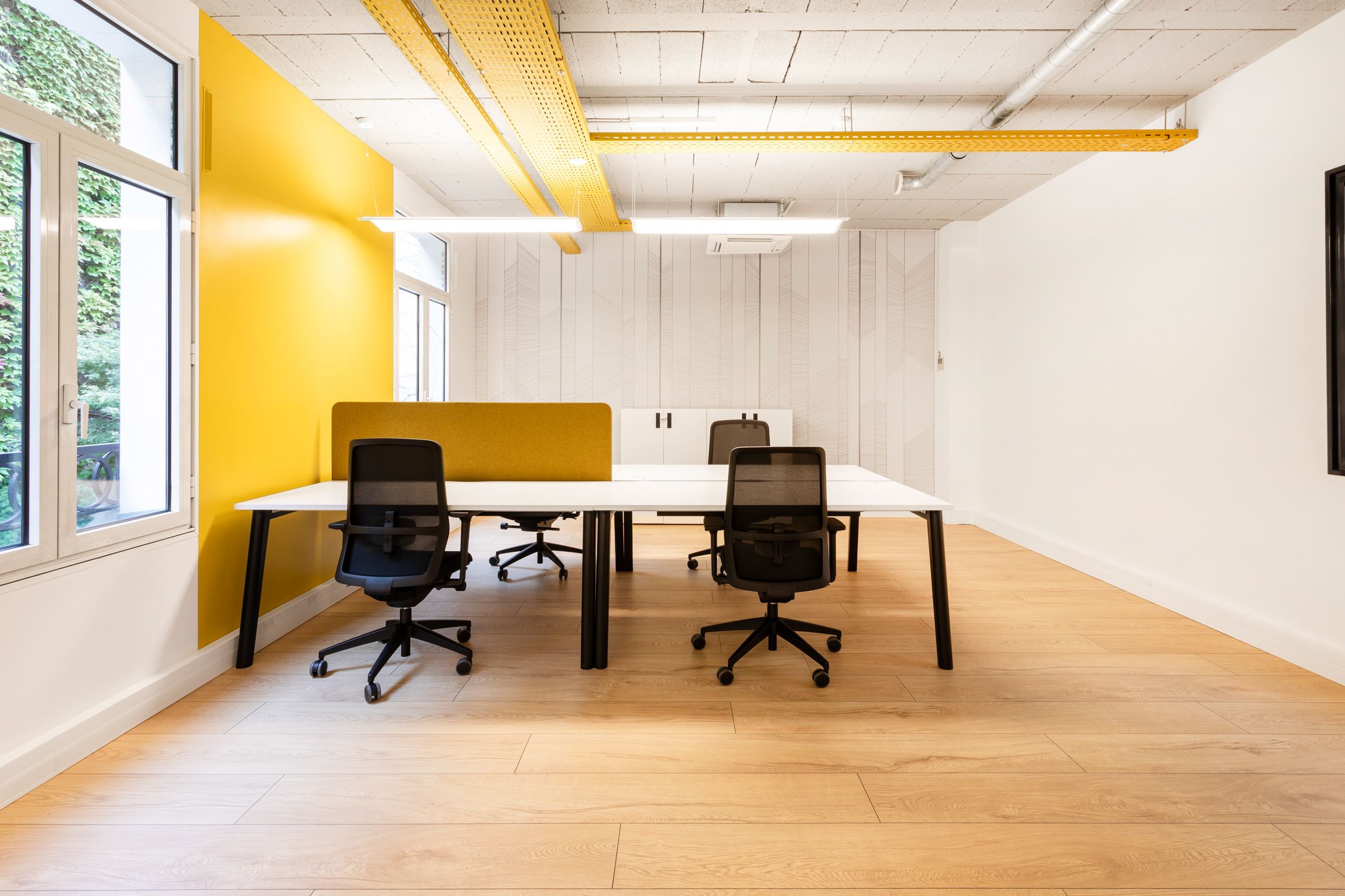 Maximisation de la lumière naturelle – Cloisons vitrées du sol au plafond, vitrophanie discrète, disposition stratégique des postes. Nous valorisons les grandes fenêtres parisiennes.